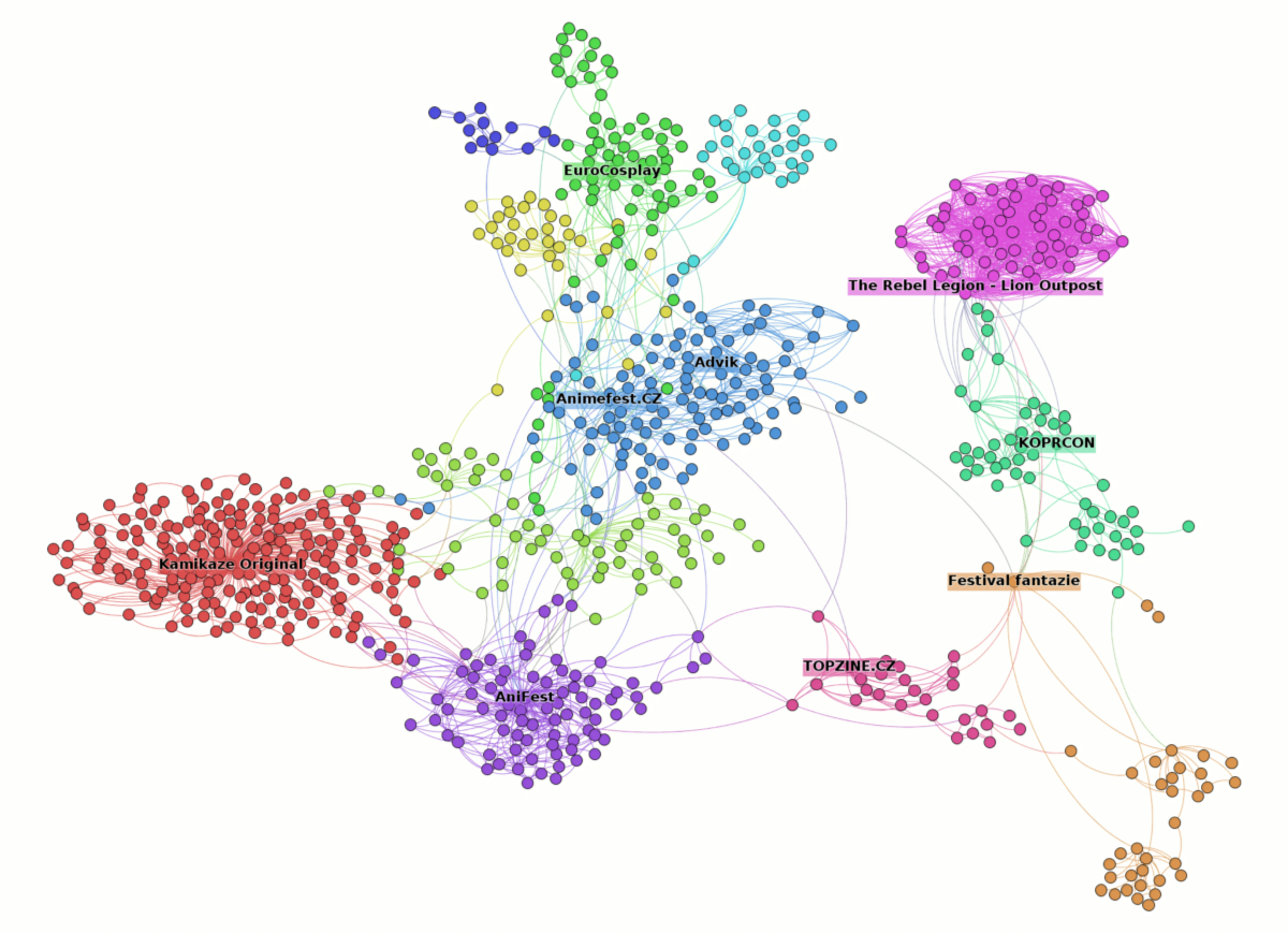 Animefest a Advik, přestože mezi sebou nemají přímou vazbu, tvoří jeden velký cluster otaku, který má zároveň nejblíže k mezinárodním komunitám (zde reprezentovaným stránkou EuroCosplay). Koprcon se ocitnul v clusteru se „seriálovými“ komunitami – Prima COOL, FAN BASE – ale zároveň má nejblíže ke komunitě Star Wars, což je zjevně vesmír sám pro sebe. Největším zklamáním byl Festival fantazie, který jaksi stojí na okraji veškerého dění, pouze s vazbou na herní weby a stránky magazínu Topzine.cz (které zde tvoří samostatný cluster).