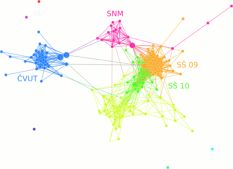 V mém případě se jasně oddělilo pět komunit: spolužáci ze SNM, z ČVUT a dva různé ročníky kamaradů ze střední školy (!). Poslední komunita vyšla méně jasně, zahrnuje „fantazáky“ a známé ze skupiny Maelström, ale i kamarády ze zcela odlišných skupin. Možná je zde příliš málo vazeb nebo zde narážím na horší rozlišovací schopnosti modularity pro malé komunity. Nicméně na „hloupý algoritmus“ a pár minut práce to není špatný výsledek. Nebo jak by řekl Josef Šlerka: