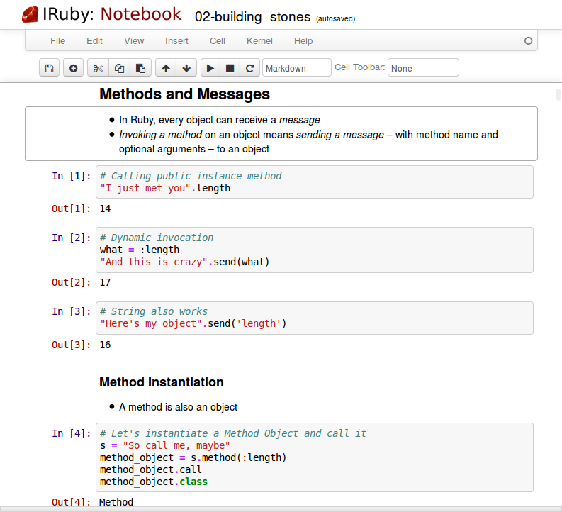 Pro nás je ovšem zásadní fakt, že výpočetní jádro nemusí být vůbec napsané v Pythonu. Alternativní jádra jsou vítaná a těší se stále lepší podpoře. Existuje například jádro pro Haskell, jádro pro jazyk Julia je dokonce oficiální součástí projektu Julia. A ano, existuje i jádro pro Ruby, obligátně nazvané IRuby.