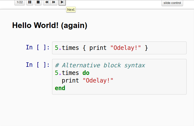 Při učení se nového jazyka (a programování vůbec) mi připadá důležitá fáze experimentování, možnost spustit existující kód, upravit jej, pozorovat změnu chování, rozbít jej, zjistit proč to nefunguje atp. Statické slidy s ukázkami kódu od experimentování spíše odrazují; pokud si chci ukázky sám vyzkoušet nebo předvést jejich variaci, kód musím postupně zkopírovat do samostatného souboru nebo do interpreta (například IRB) – „ideálně“ je kód přes několik slidů s vnořenými bloky. V případě MI-RUB udržujeme část ukázek stranou. To znamená více práce s údržbou pro nás a ztrátu času s hledáním kódu pro studenty (nemluvě o porušení DRY).