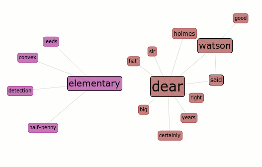 Graf vazeb pro slova „elementary“ a „dear“ – nemají mezi sebou ani nepřímou vazbu (slovo „my“ bylo odstraněno jako stopslovo). Zdroj – případně vyzkoušejte včetně stopslov.